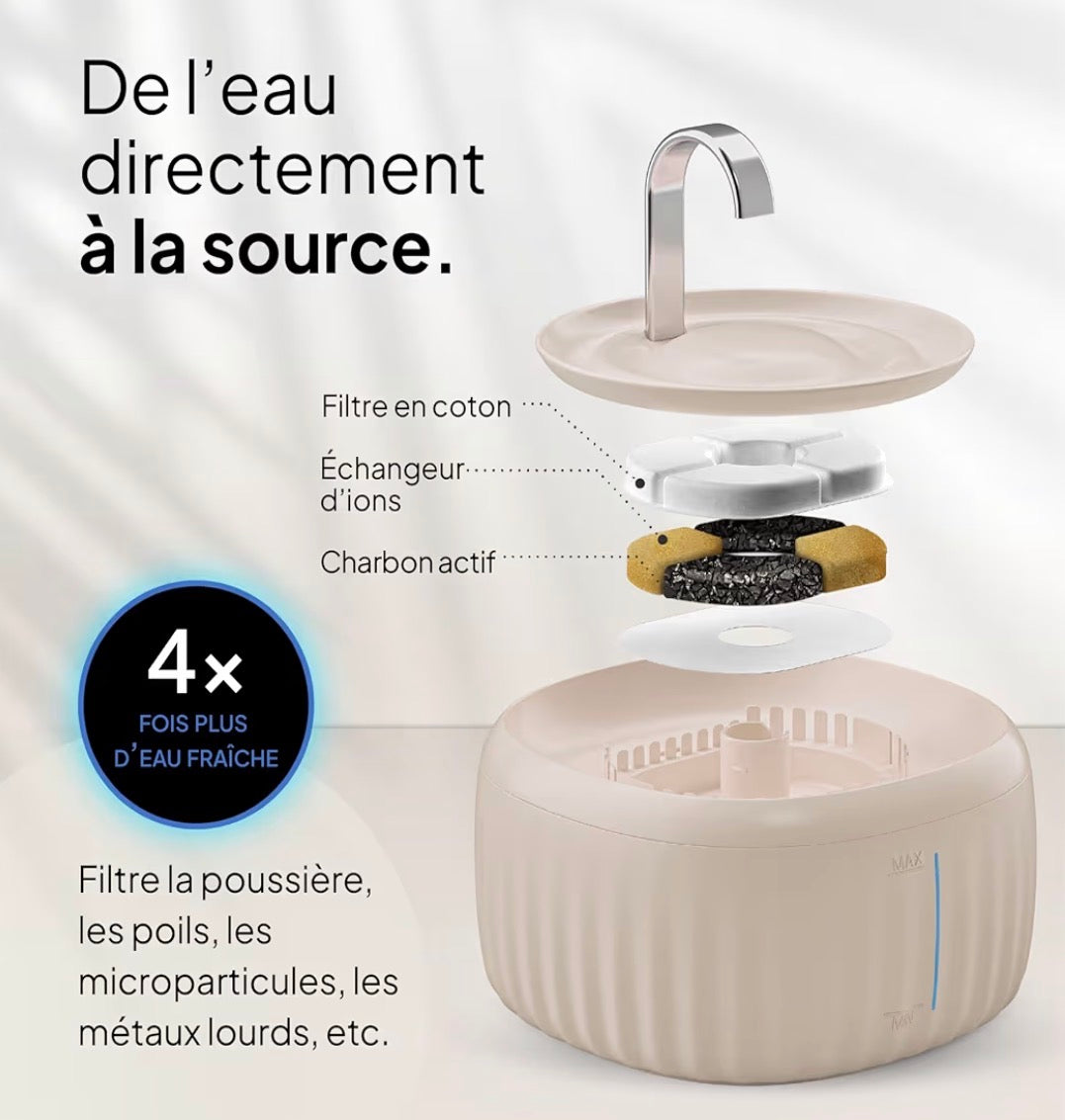 Grâce à son système de filtration en trois étapes (filtre en coton, charbon actif et échangeur d’ions), l’eau est purifiée des poils, poussières, microparticules, mauvaises odeurs et métaux lourds. Votre animal bénéficie ainsi d’une eau plus saine, jour après jour.