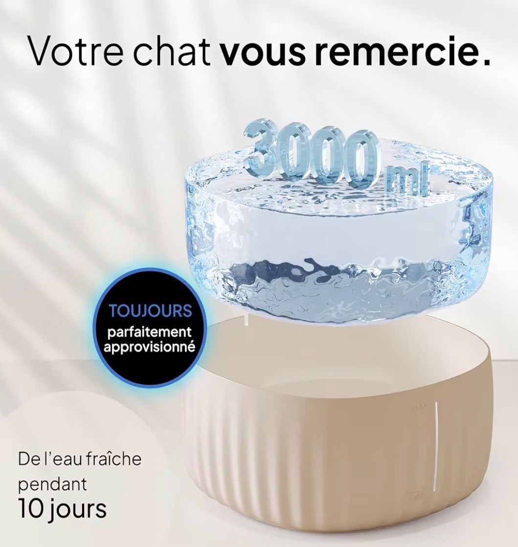 Avec une grande capacité de 3 litres, la fontaine peut fournir de l’eau fraîche jusqu’à 10 jours, idéale pour un usage quotidien ou lors de vos absences. Le niveau d’eau est visible grâce à un indicateur lumineux, qui clignote lorsque le niveau est bas.
